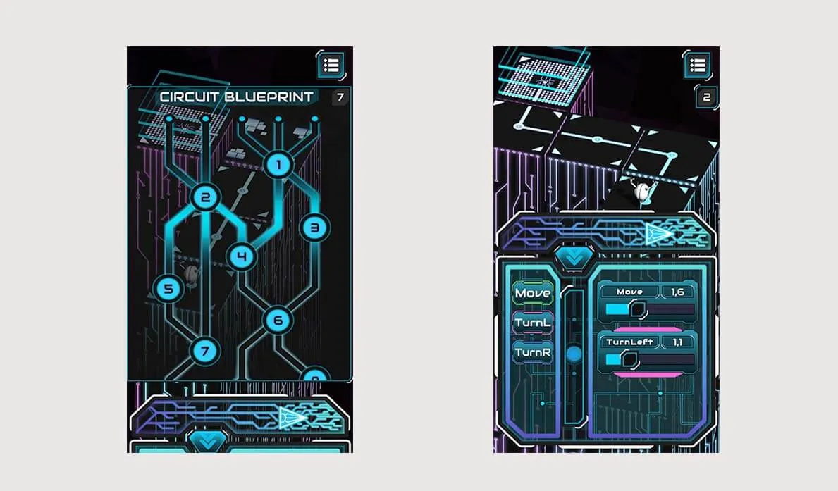 The game consists of different levels with different types of obstacles and routes. The task for the player is to reach the final point without running out of movements or falling off the game map. Dot's movement types are: move forward, jump, turn right, turn left and stop. Each movement can be set between 0-5 seconds and can be used more than once.